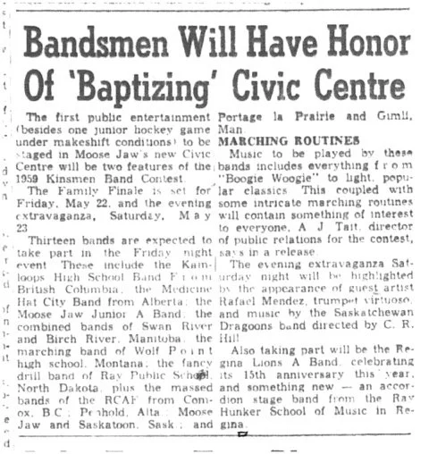 The first public entertainment (besides one junior hockey game under makeshift conditions) to be staged in Moose Jaw’s new Civic Centre will be two features of the 1959 Kinsmen Band Contest.